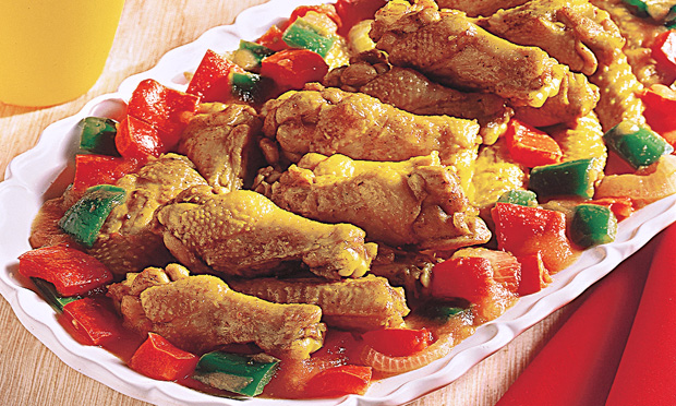 Corte cada asa de frango em três partes e descarte as pontas. Amasse o alho e tempere a carne.Acrescente o sal e o açafrão. Numa frigideira, aqueça o óleo em fogo alto e frite o frango, regando aos poucos com a água. Raspe o fundo da frigideira por 25 minutos ou até dourar bem. Molho: Corte os pimentões em quadrados pequenos. Coloque-os numa panela com os ingredientes restantes e refogue em fogo médio, mexendo de vez em quando, por 15 minutos ou até os legumes ficarem macios. Leve a frigideira com o frango ao fogo alto e aqueça rapidamente. Transfira o molho reservado para uma travessa, ponha o frango por cima e sirva imediatamente.